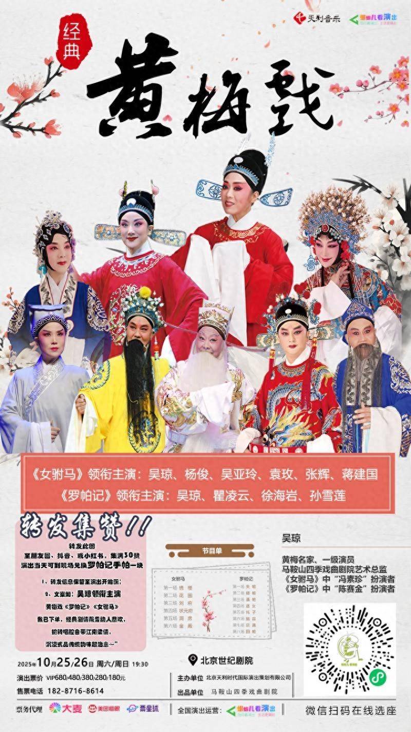马鞍山四季戏曲剧院的九位黄梅戏名家,将于10月25日至26日携典藏版《女驸马》与《罗帕记》登陆北京世纪剧院,为观众献上一场承载50载艺术情怀、兼具传承厚度与市场口碑的戏曲盛宴。